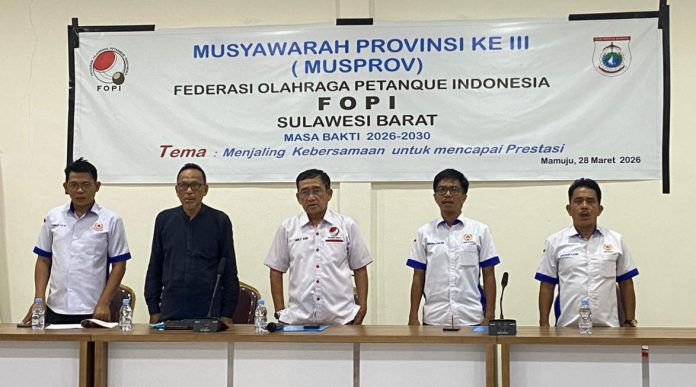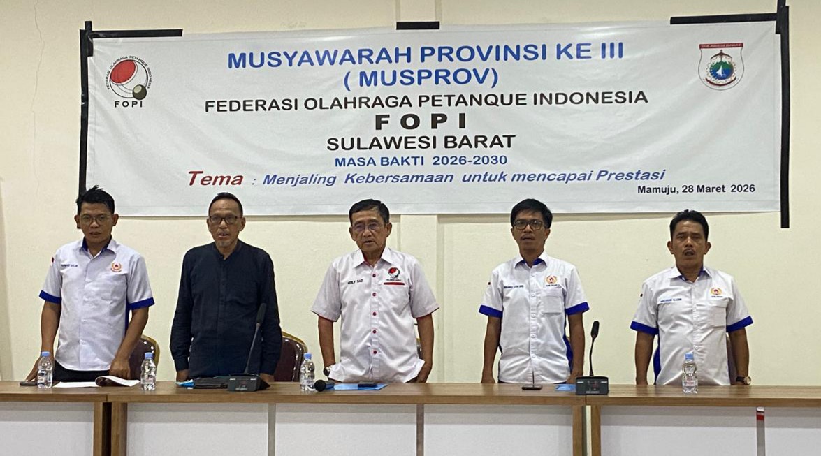 SULBARTERKINI.COM, Mamuju — Pengurus Provinsi Federasi Olahraga Petanque Indonesia (FOPI) Sulawesi Barat, menggelar Musyawarah Provinsi (Musprov) Ke-3 yang berlangsung di Aula Kantor KONI Provinsi Sulawesi Barat, Sabtu (28/3/26).