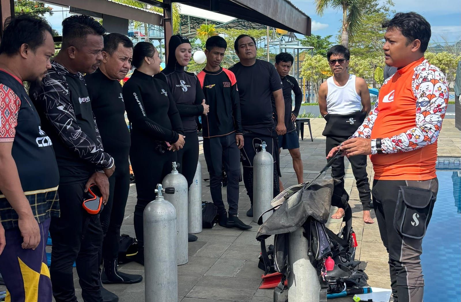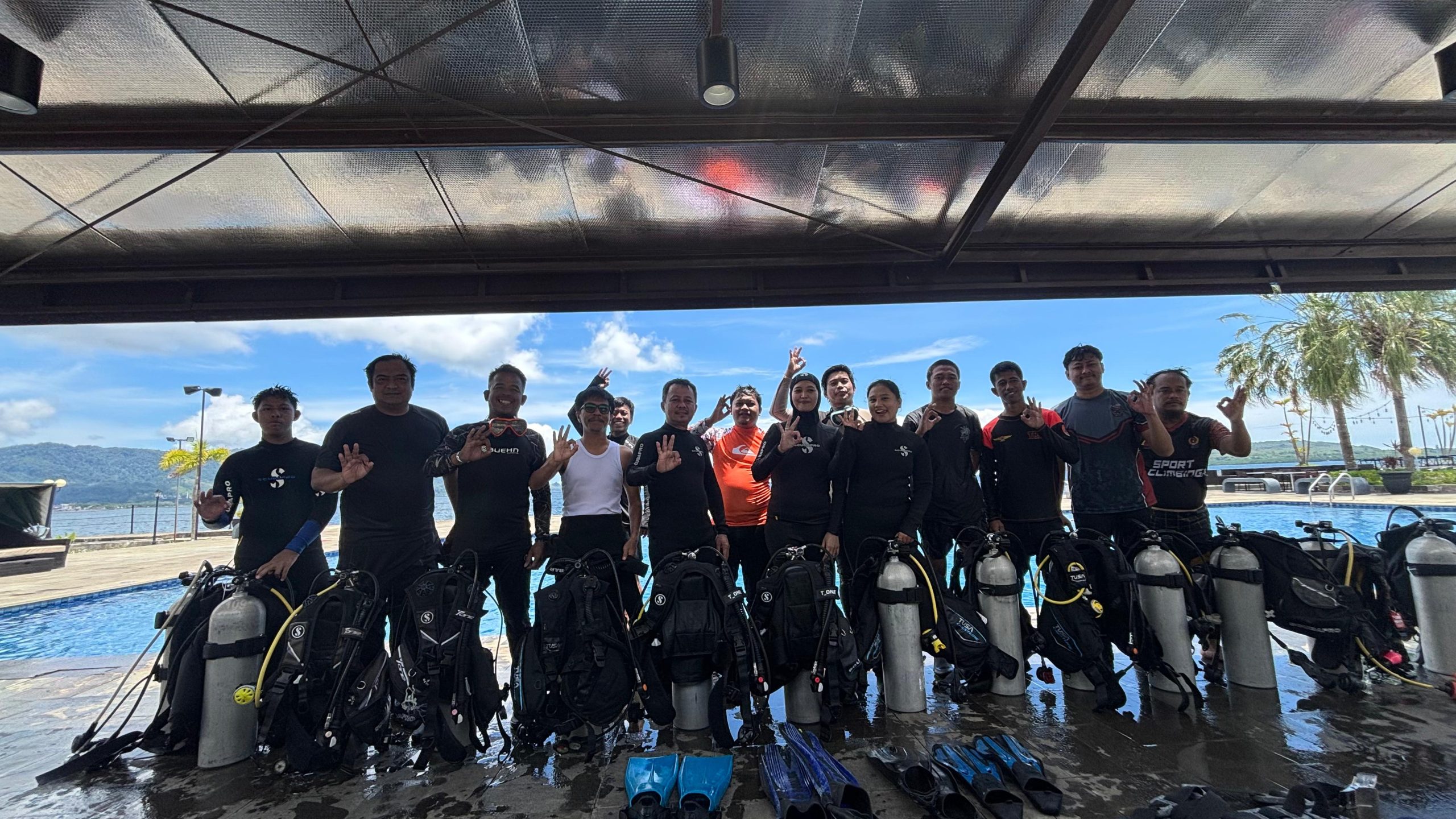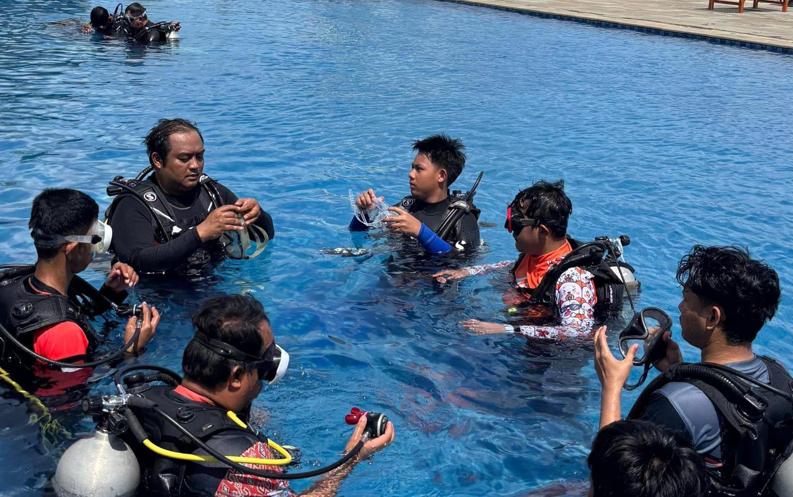 Sesi praktik ini menjadi tahapan krusial sebelum peserta melakukan penyelaman langsung di laut. Di bawah arahan instruktur, peserta tampak antusias mengikuti setiap tahapan, mulai dari pengenalan alat, teknik pernapasan, hingga simulasi menyelam di dalam air.