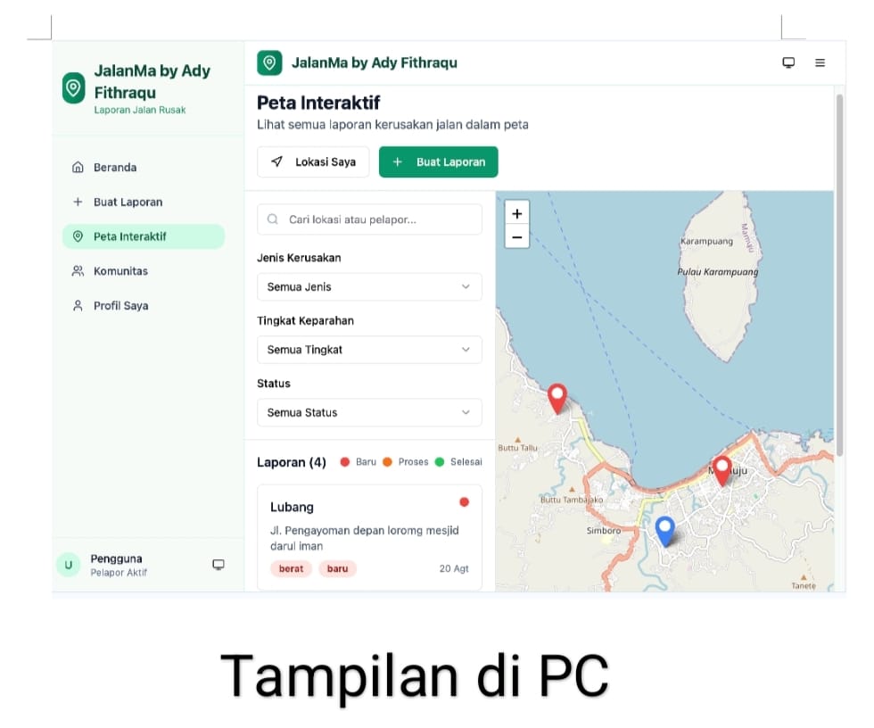 Pemprov Sulbar juga menyiapkan laman khusus berbasis web : https://app–jalan-ma-76c7c030.base44.app, untuk masyarakat yang lebih nyaman melapor melalui handphone atau komputer.